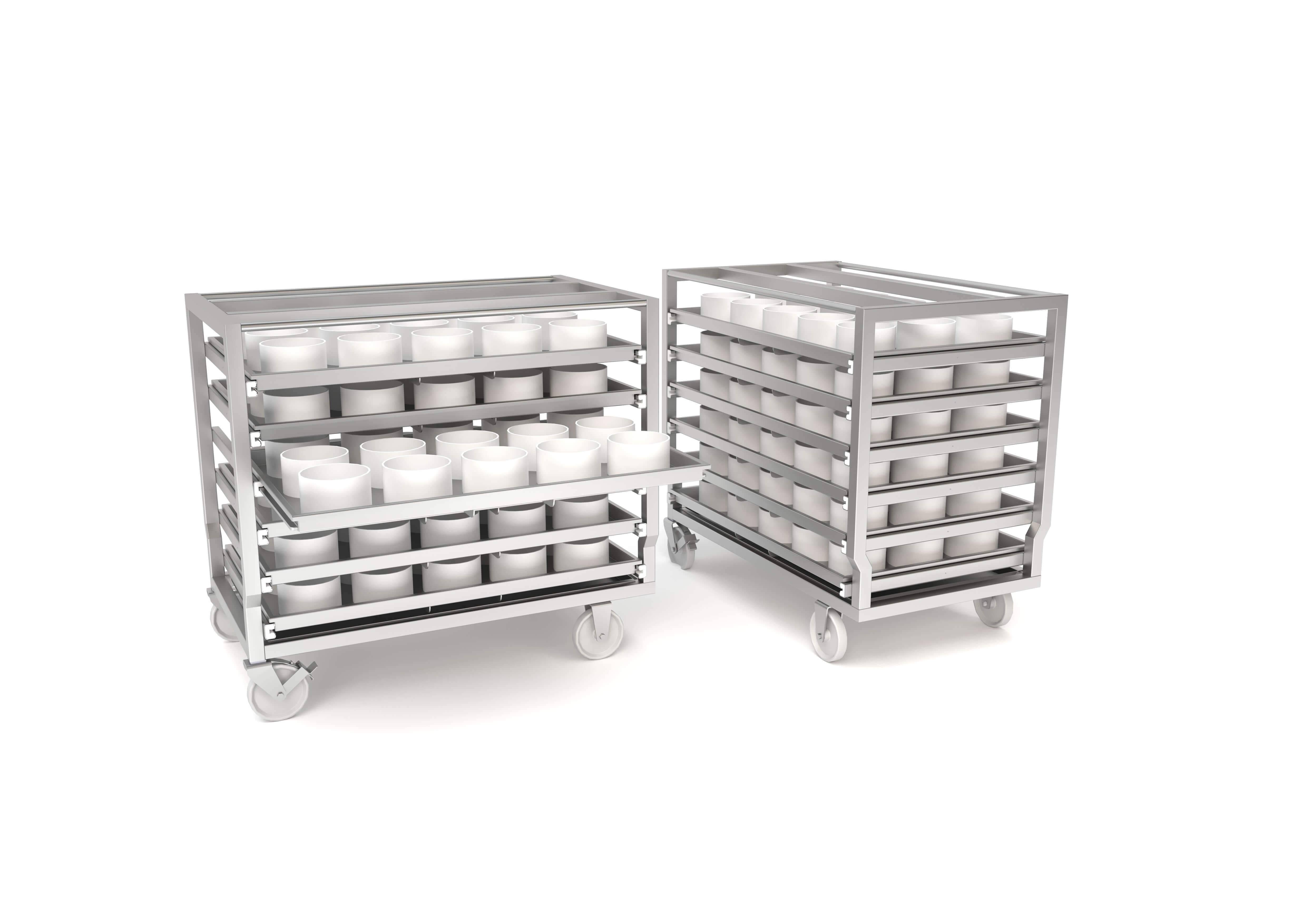 The draining cart is perfectly suitable for stacking and temporarily storing of the cheese after pressing, especially for smaller cheese production plants.