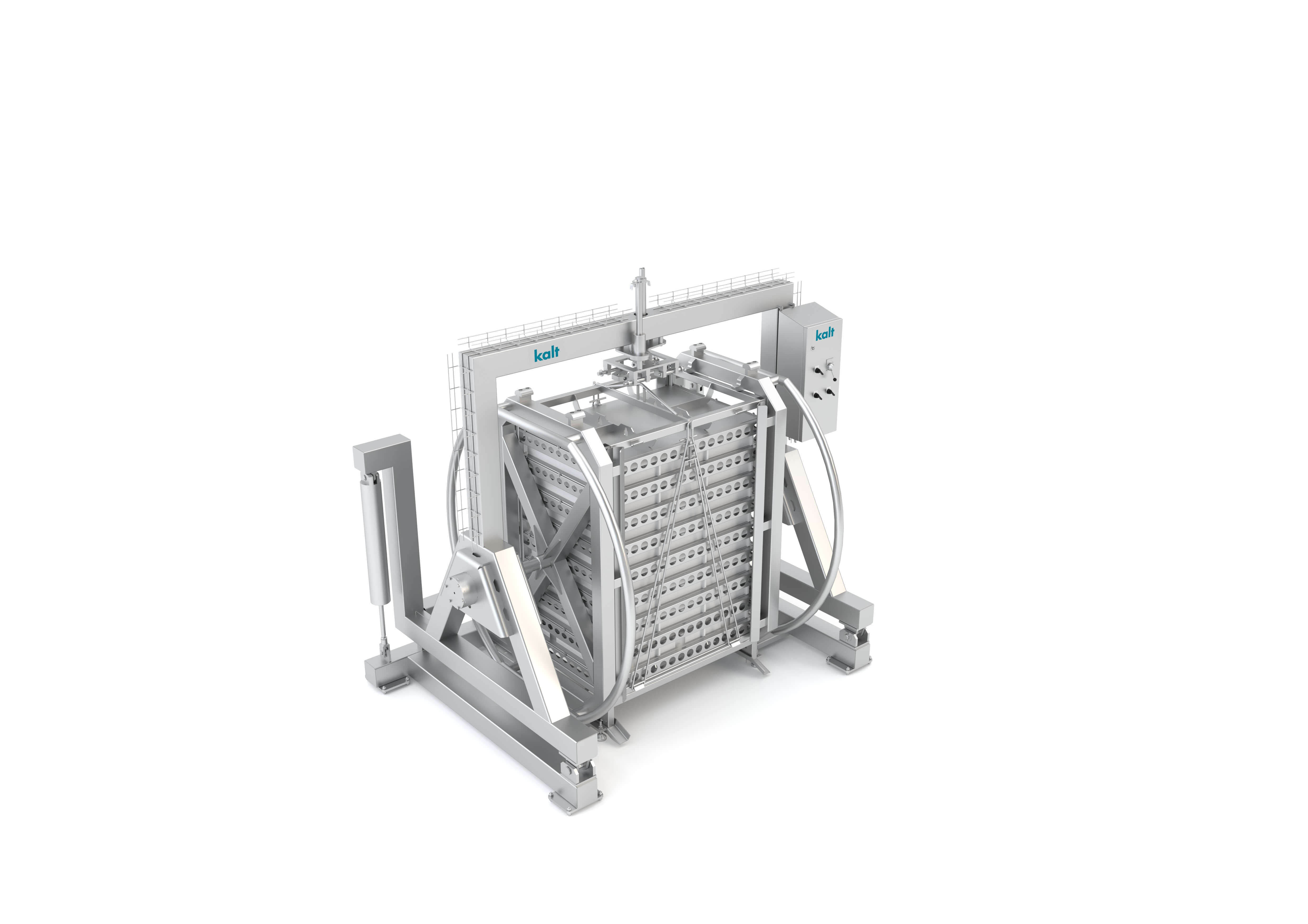 It must be turned to produce a homogeneous cheese. To accomplish this, the hurdle stack can be clamped in the turning system and turned upside down to allow the cheese to drain.