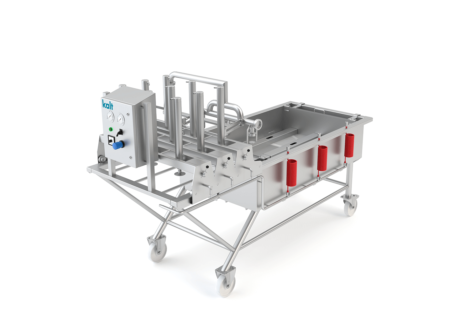 Die patentgeschützte Kalt-Kassettenpresse ist für den Ein- und Mehrchargenbetrieb konzipiert. Der Käsebruch wird automatisch in die runden oder eckigen Formen eingeschwemmt, schonend gepresst und aus den Formen auf ein Förderband zur Weiterbehandlung ausgebracht.