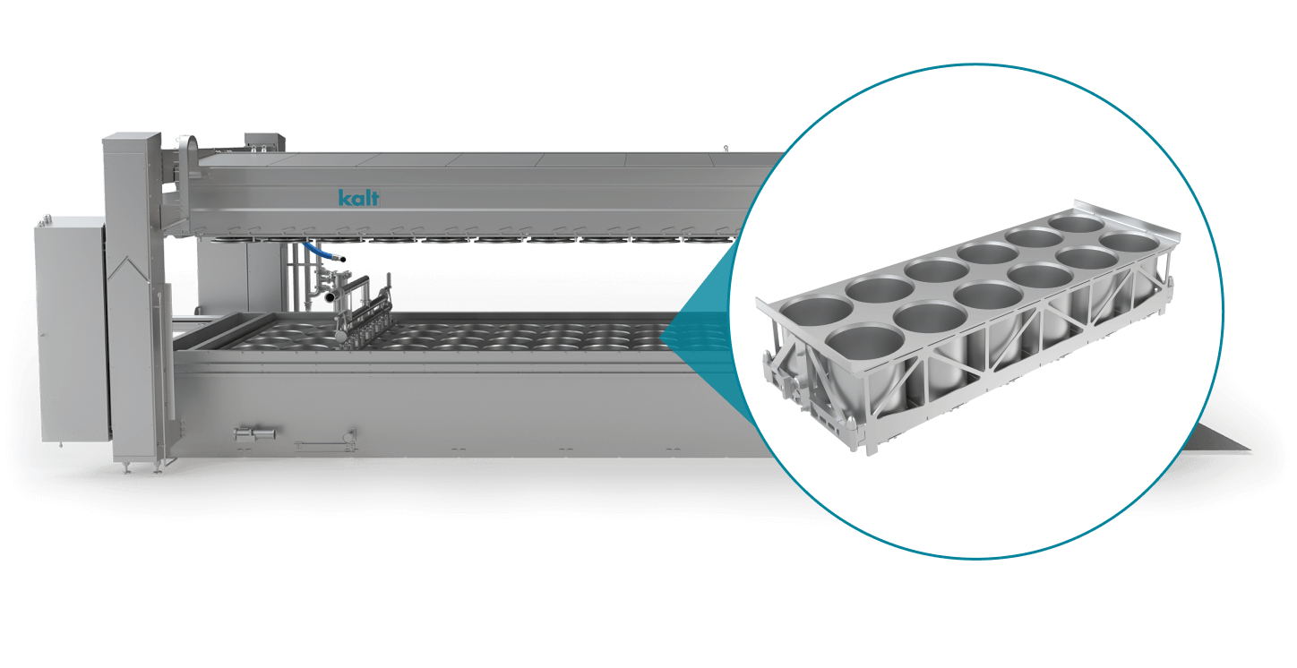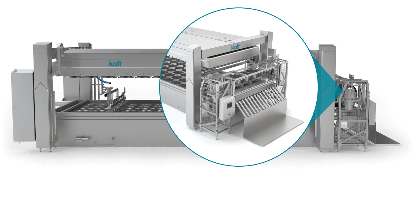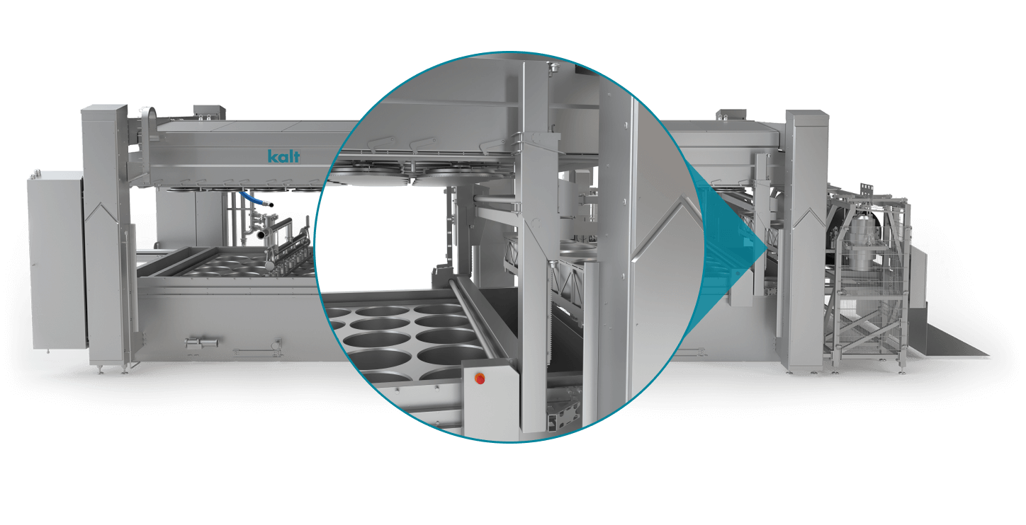 Durch die fortschrittliche Kalt Rütteltechnologie wird das Ausformen hygienisch und schonend durchgeführt. Danach kann ihr Produkt direkt in den Salzbadkanal oder auf ein Förderband oder Tisch umplatziert werden.